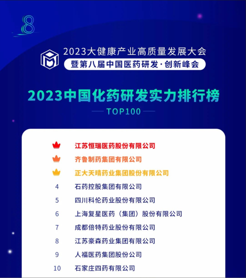 由药智网、中国药业杂志社主办的2023大健康产业高质量发展大会暨第八届中国医药研发•创新峰会于6月16日开幕,会上发布了《2023中国药品研发实力排行榜》系列榜单,金年会- 金字招牌医药凭借深厚的创新研发实力再创辉煌:荣登《2023中国药品研发综合实力排行榜TOP100》榜首、《2023中国化药研发实力排行榜TOP100》榜首。值得一提的是,今年是金年会- 金字招牌医药连续第6年入选《中国药品研发综合实力排行榜》榜首。