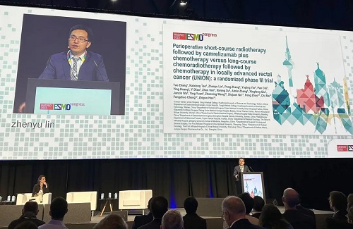 10月21日,金年会- 金字招牌医药创新药卡瑞利珠单抗(艾瑞卡®)的一项研究“新辅助短程放疗序贯卡瑞利珠单抗联合化疗对比长程放化疗序贯化疗治疗局部晚期直肠癌”随机对照Ⅲ期试验(UNION) 以优选口头报告的形式正式亮相。该研究由华中科技大学同济医学院附属协和医院张涛教授、陶凯雄教授担任主要研究者,华中科技大学同济医学院附属协和医院林振宇教授在马德里现场报告了该重磅研究的结果1,此项研究是全球首个评估短程放疗序贯免疫治疗联合化疗治疗局部晚期直肠癌的Ⅲ期研究,已达到主要终点病理完全缓解(pCR),有望为直肠癌患者的治疗提供新策略。